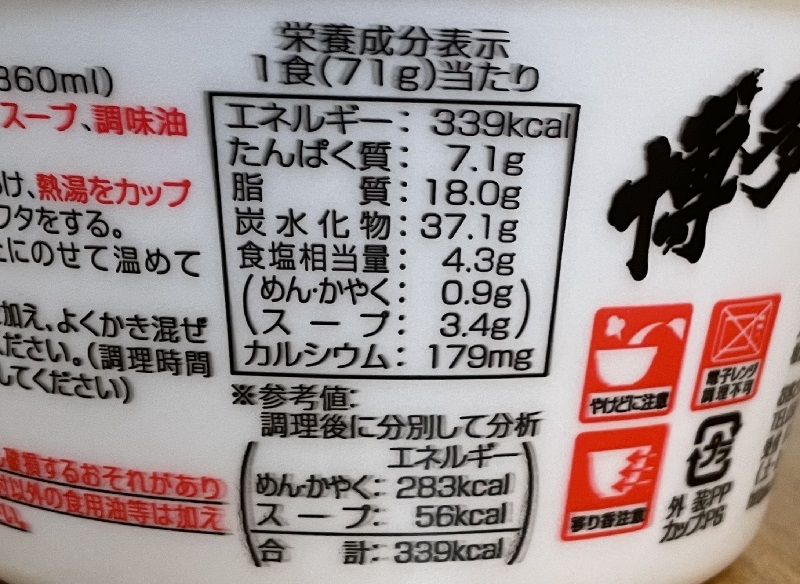 カロリーは339kcal、炭水化物37.1g、塩分4.3g。