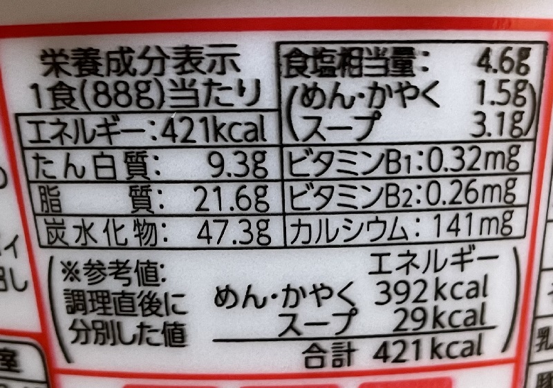 カロリーは421kcal、炭水化物47.3g、塩分4.6g。