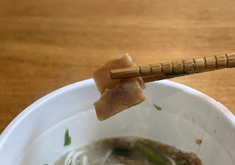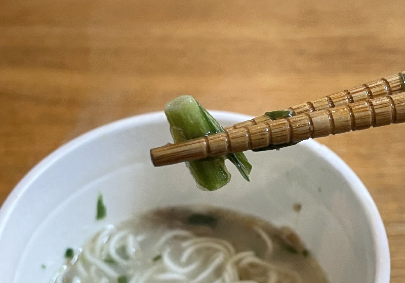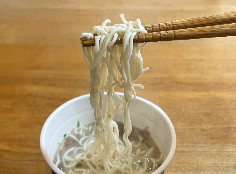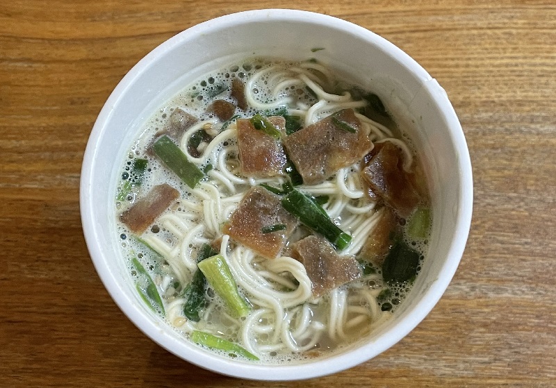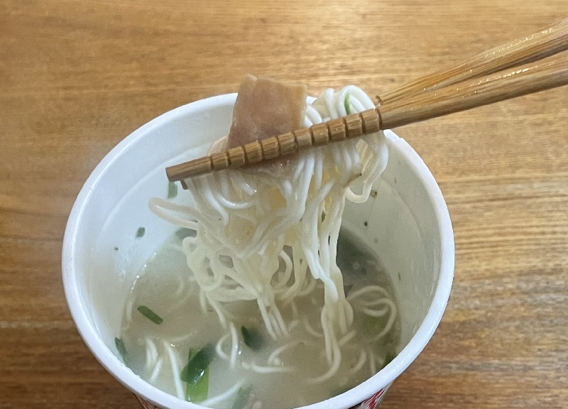 タテ型カップ麺ながら、ノンフライ麺。パツ感がちゃんとあって、スープの持ち上げもいい。旨いです。