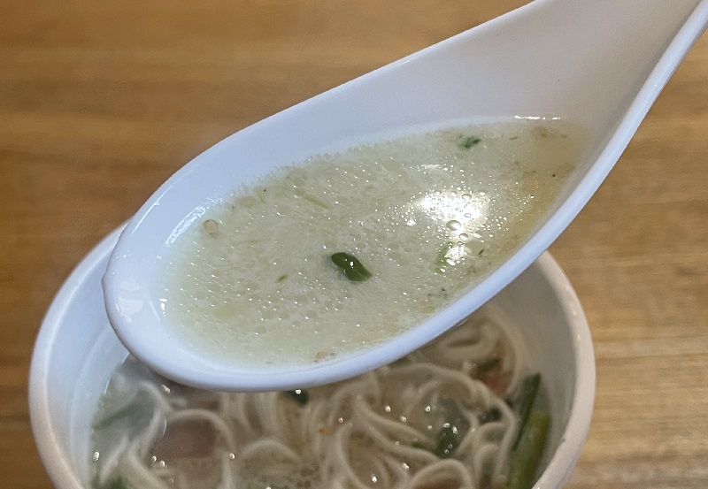 アッサリとした豚骨スープ。豚骨とホタテエキスの優しい味わい。奥の方に生姜の風味が感じられます。