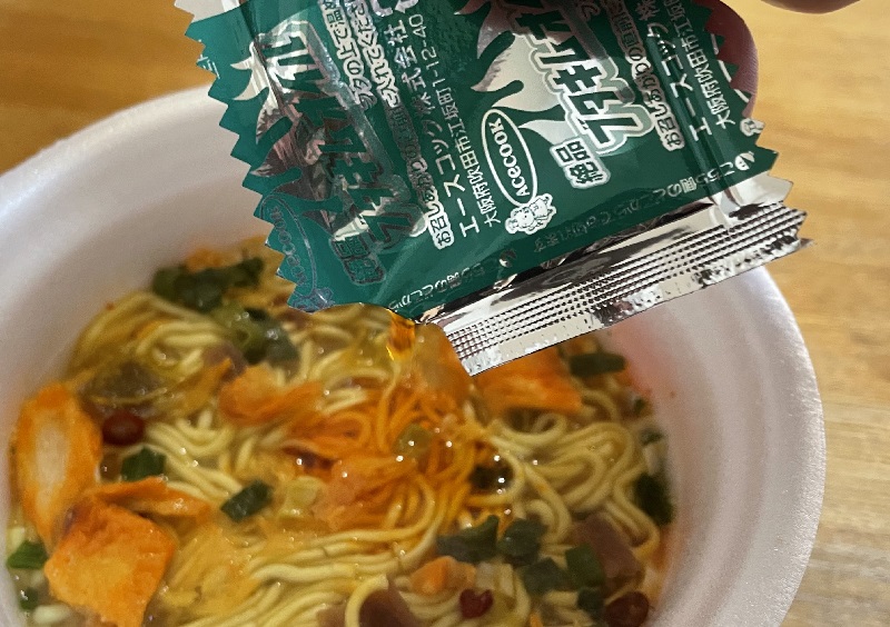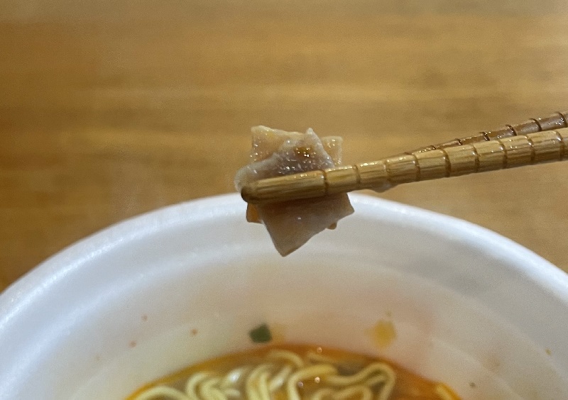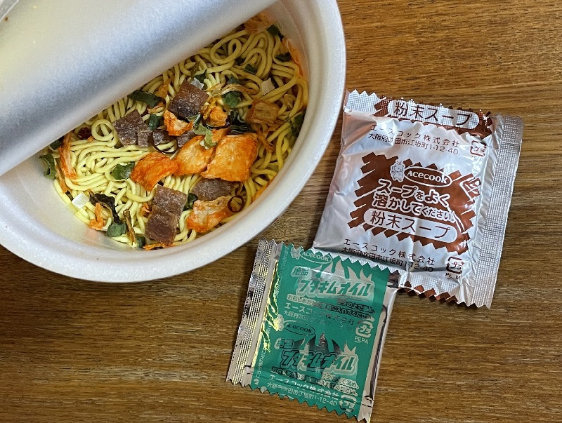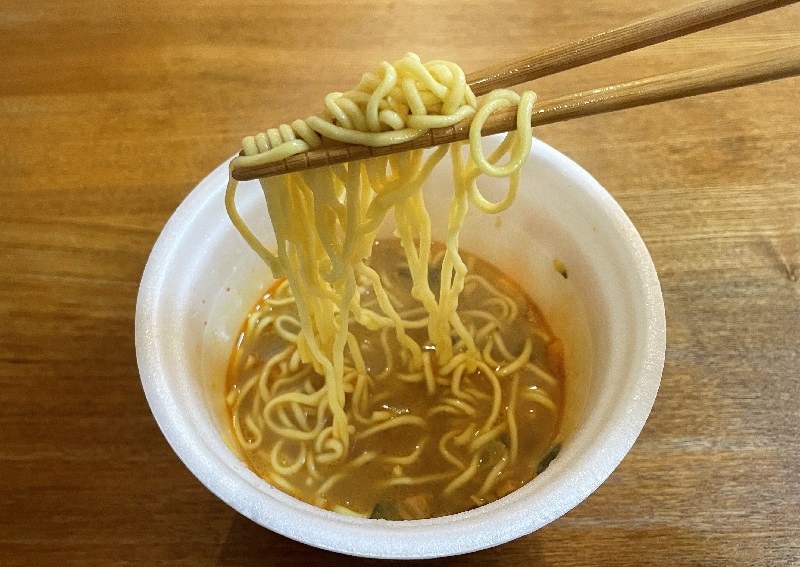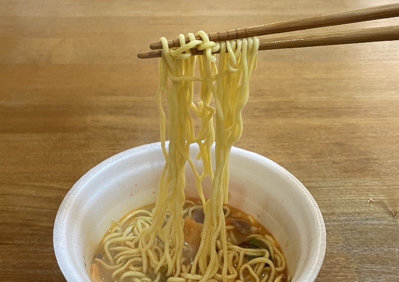 スーパーカップ定番の中太丸麺に、かやくが混ざっています。