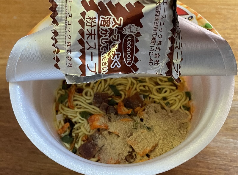粉末スープを加え、熱湯を注ぎます。