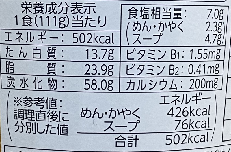 カロリーは502kcal、炭水化物58.0g、塩分7.0g。お店のイメージに合わせて、タテ型BIGサイズですね。