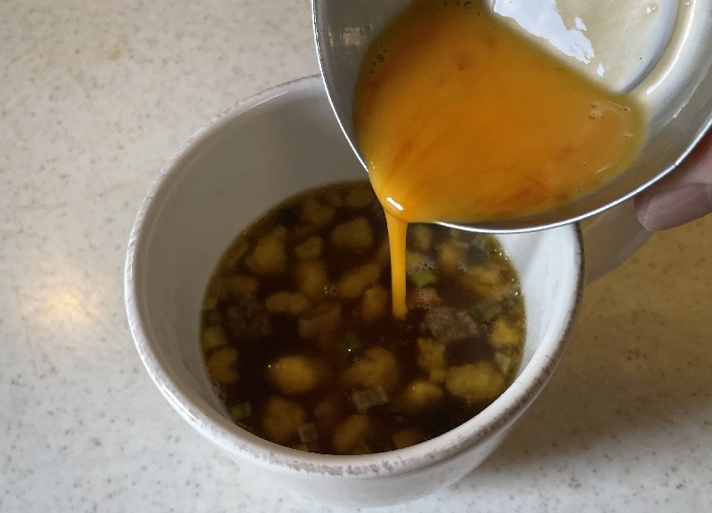 残ったスープをマグカップに移し、溶き卵を加えよく混ぜる。