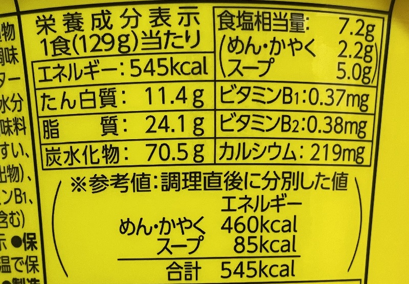 カロリーは545kcal、炭水化物70.5g、塩分7.2g。