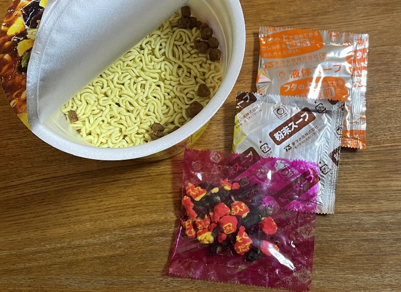 麺は、大盛カップ麺のスタンダードなヤツ。このチープ感がまたいい。