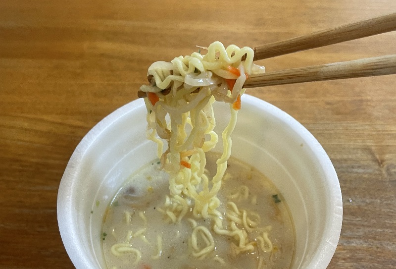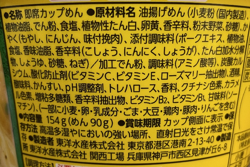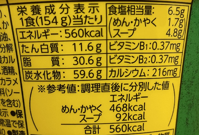 カロリーは560kcal、炭水化物59.6g、塩分6.5g。大盛カップ麺ではあるものの、「タンメン」なのでそれほど高い数値ではないですね。