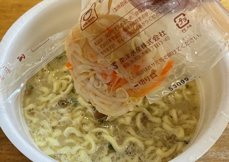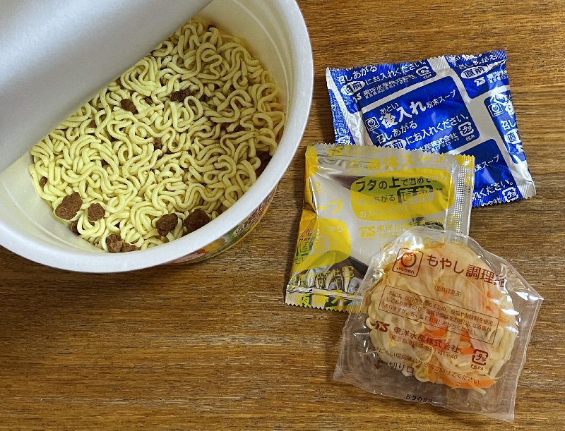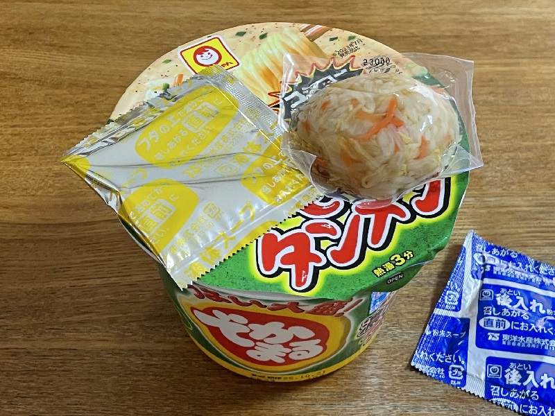 蓋の上に液体スープと野菜を乗せ待つこと3分。粉末スープも後入れ。