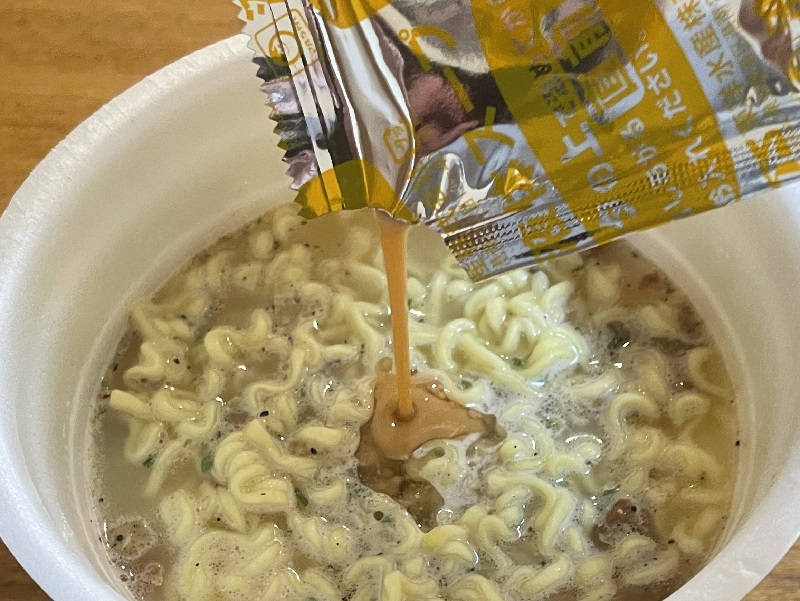 3分経ったので、2種のスープを加え、