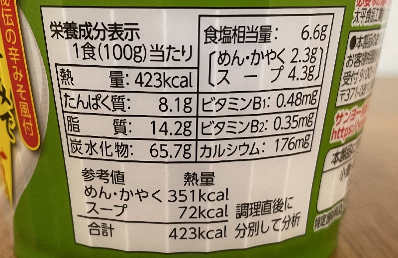 カロリーは423g、炭水化物65.7g、塩分6.6g。