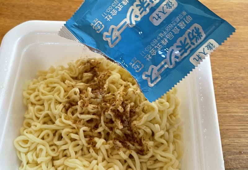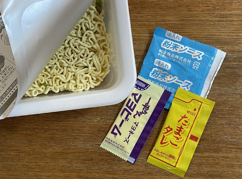 内容は、中太の油揚げ麺に、小袋3つ。粉末スープ、お馴染みマヨビームとたまごタレ。