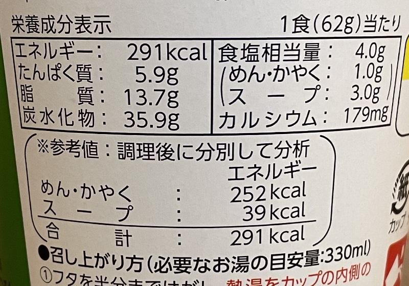 カロリーは291kcal、炭水化物35.9g、塩分4.0g。比較的ライトな一杯。