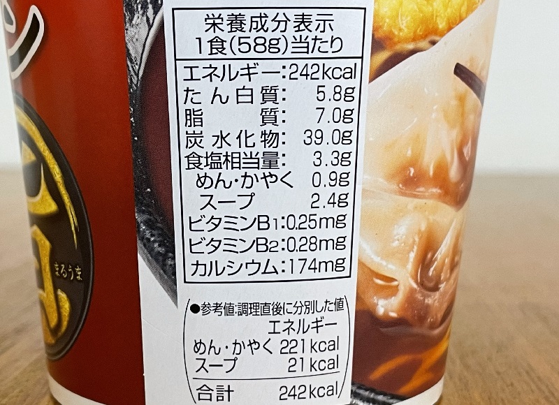 カロリーは242kcal、炭水化物39.0g、塩分3.3g。ライトです。