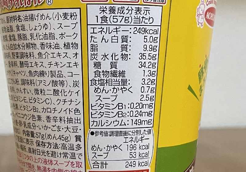 カロリーは249g、炭水化物35.5g、塩分3.2g。数値はかなりライト。