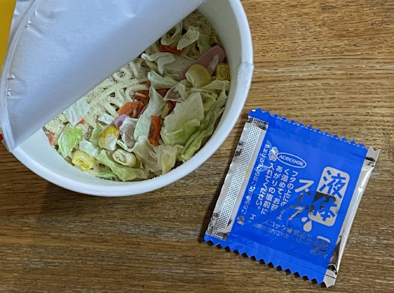 麺は中太の油揚げ麺。後入れの液体スープが付属。
