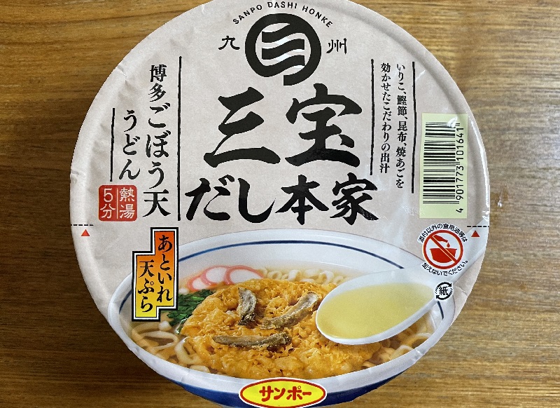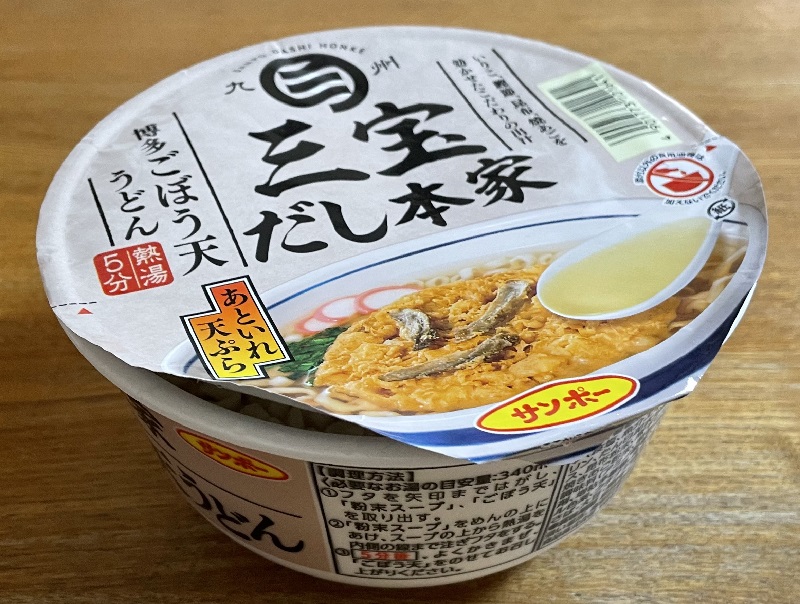 九州の名物「ごぼ天うどん」をカップ麺で再現したもの。関東ではめったに売ってませんが、偶然手に入れたのでとても楽しみ。