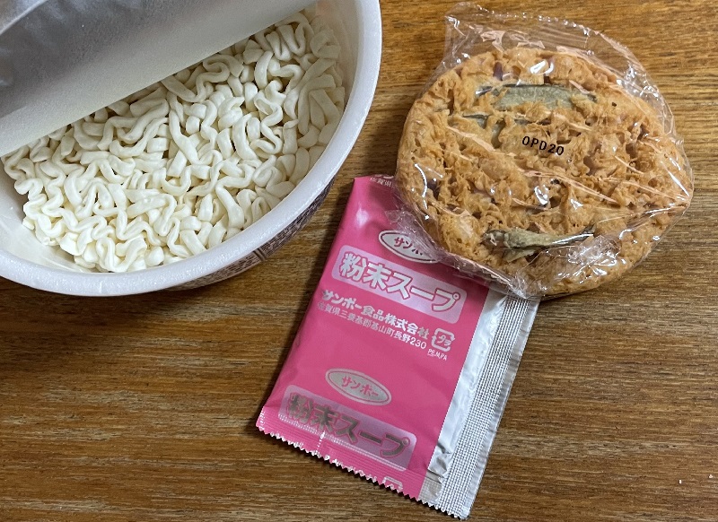 内容は、シンプルに油揚げ麺、粉末スープ、後入れ天ぷら。