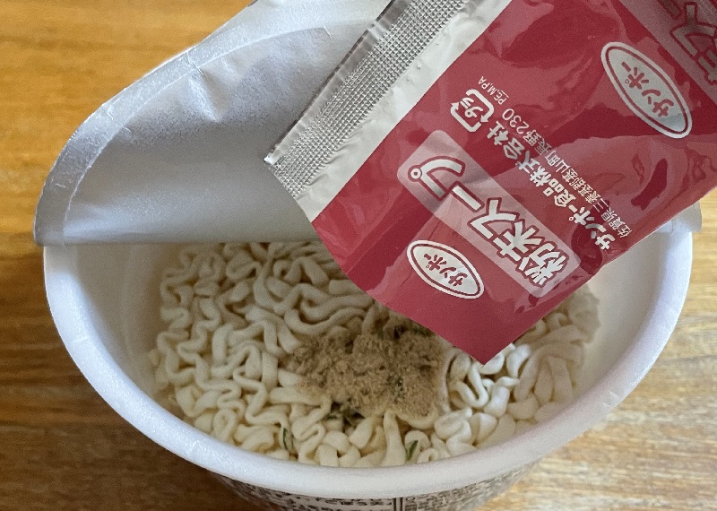 粉末スープを入れ、熱湯を注ぎ、