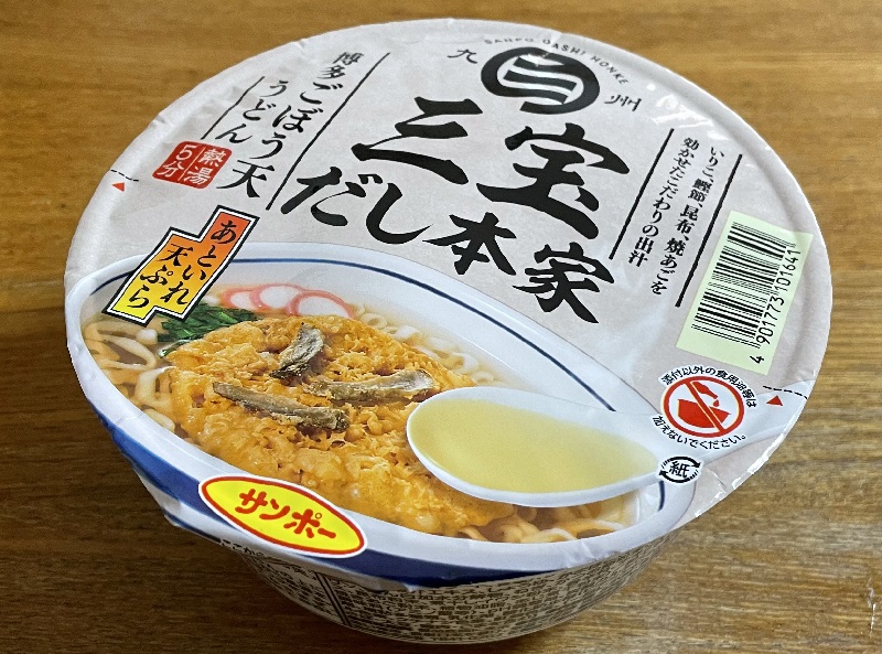 九州の名物「ごぼ天うどん」をカップ麺で再現したもの。関東ではめったに売ってませんが、偶然手に入れたのでとても楽しみ。