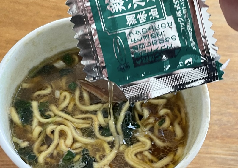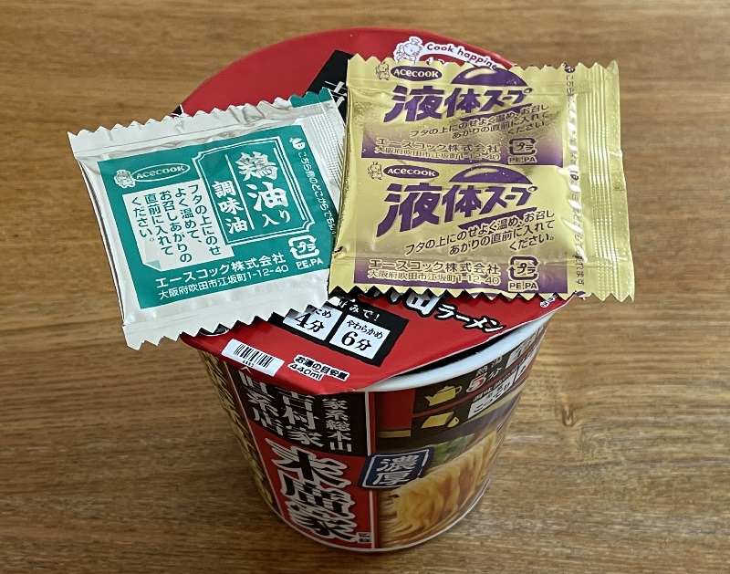 内容は、太めの油揚げ麺に小袋が2つ。液体スープと鶏油。