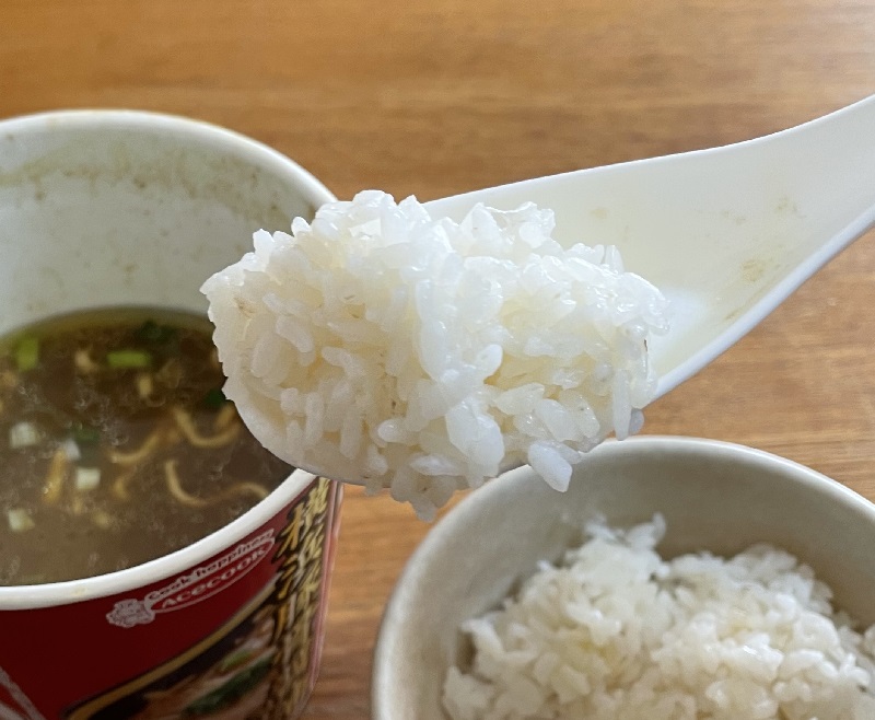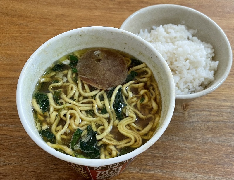 完成です。エースコック【末廣家 横浜豚骨醤油ラーメン】出来ました。お決りの「ライス」を添えて。