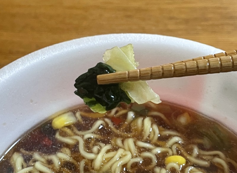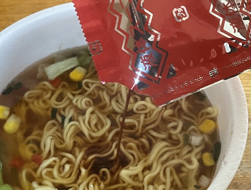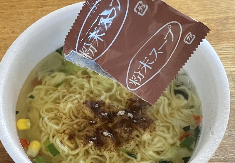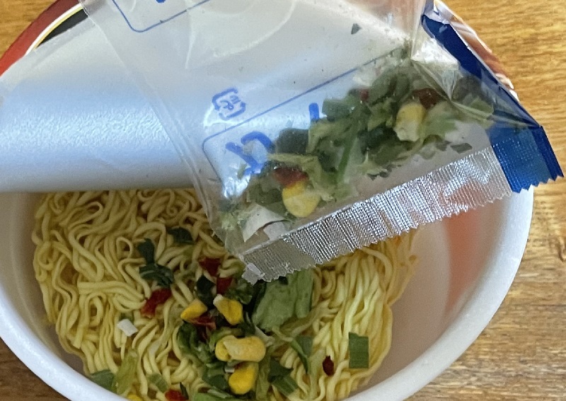 内容は、ウェーブのかかったノンフライ麺に小袋3つ。かやくとスープが2種です。