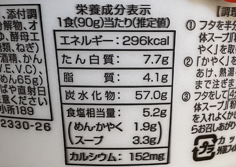 カロリーは296kcal、炭水化物57.0g、塩分5.2g。程々の熱量。