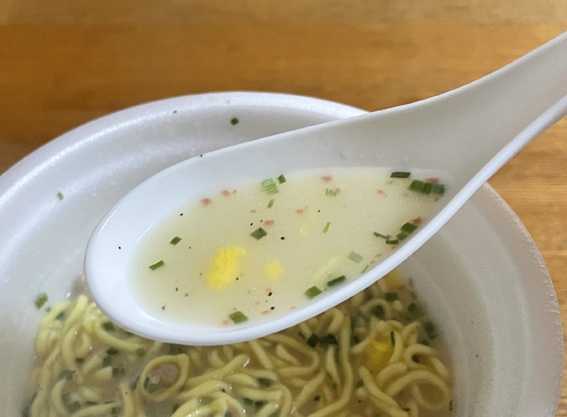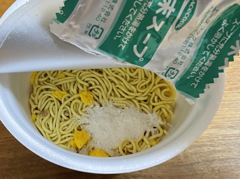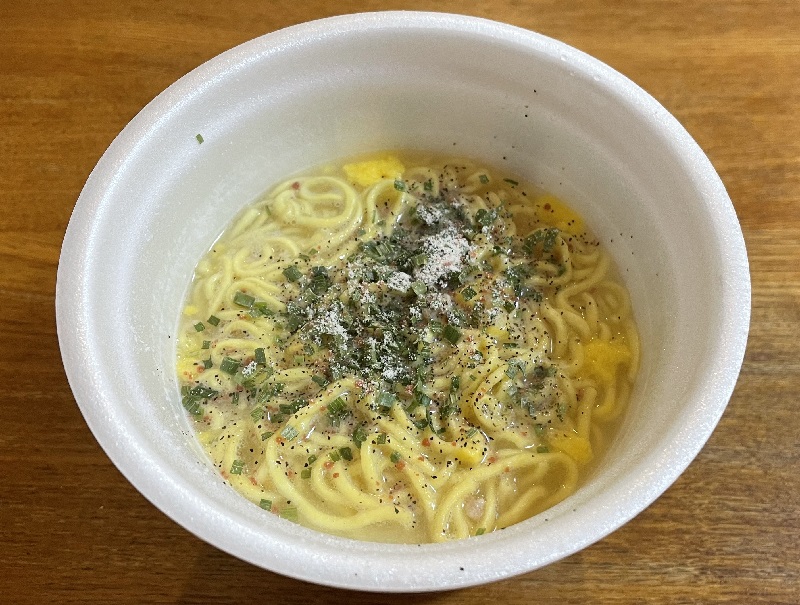 おー、カルボナーラ味です。不思議な感覚ですが、美味しい。ふりかけの胡椒がいいアクセントになってます。
