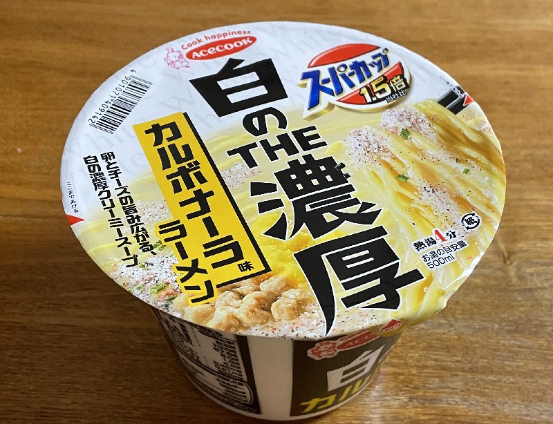 大盛カップ麺の雄、エースコック・スーパーカップの変わり種【白のTHE濃厚 カルボナーラ味ラーメン】を食べてみました。