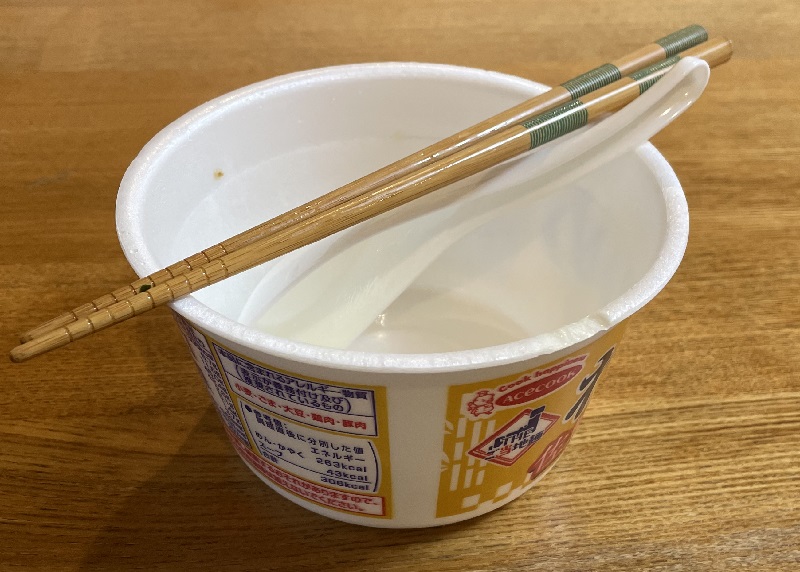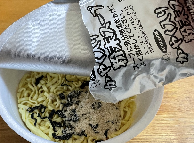「かやく入り粉末スープ」を器に入れ、熱湯を注ぎます。
