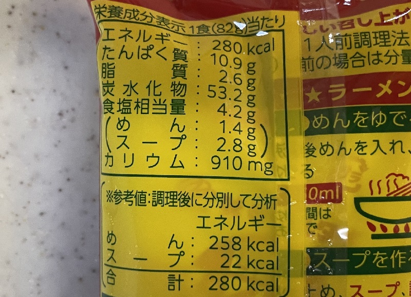 1食当たりのカロリーは280kcal、炭水化物53.2g、塩分4.2g。