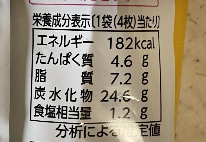 1枚当りのカロリーは46kcal、炭水化物6.2g、塩分0.3g。