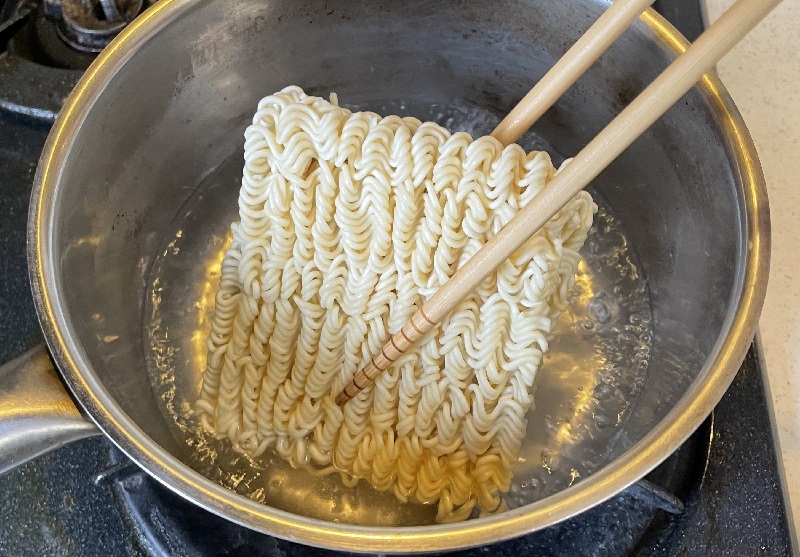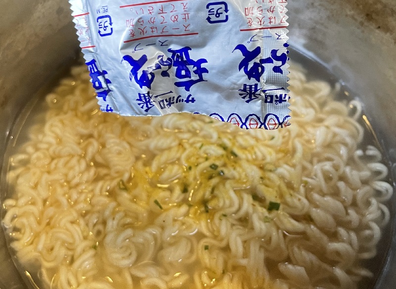 2分経ったら、火を止めて粉末スープを投入。