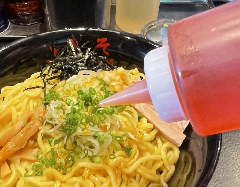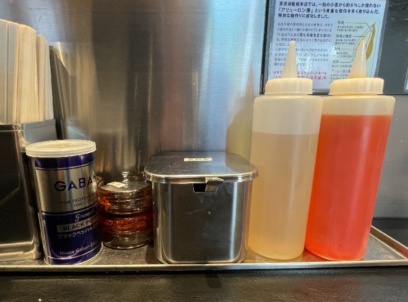 卓上調味料は、黒胡椒、刻み玉ねぎ、お酢、ラー油2種。