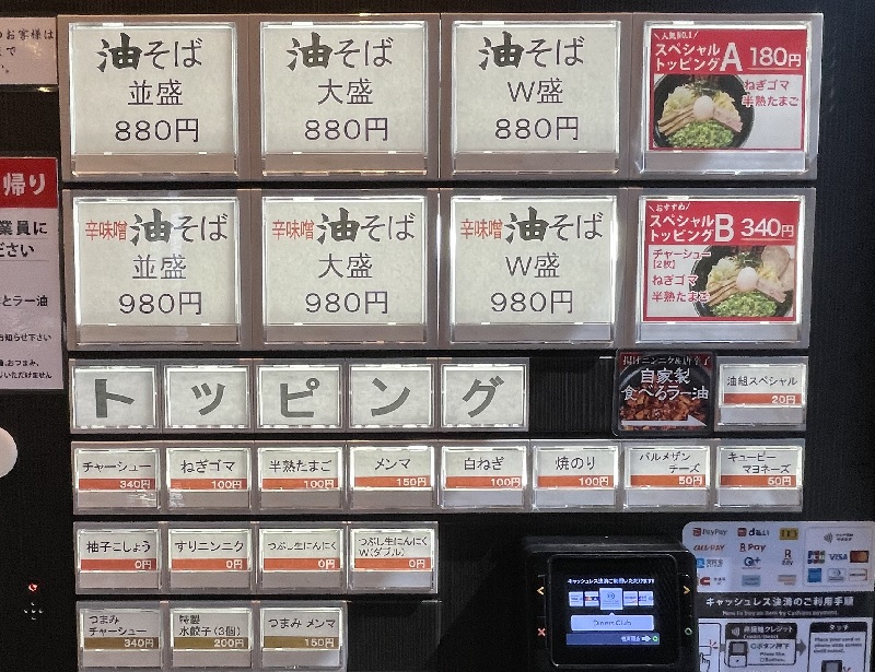 入口すぐの券売機で、「油そばW盛」880円と「柚子こしょう」0円、「つぶし生にんにくW」0円の食券を購入。