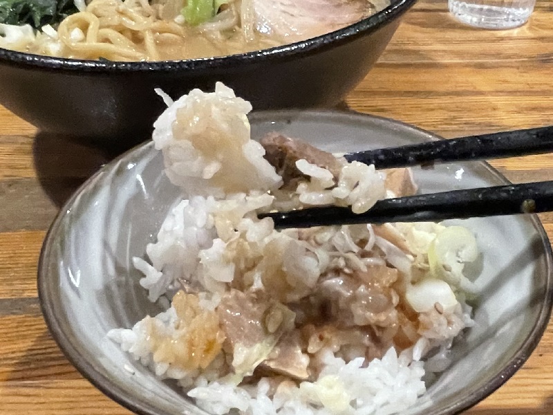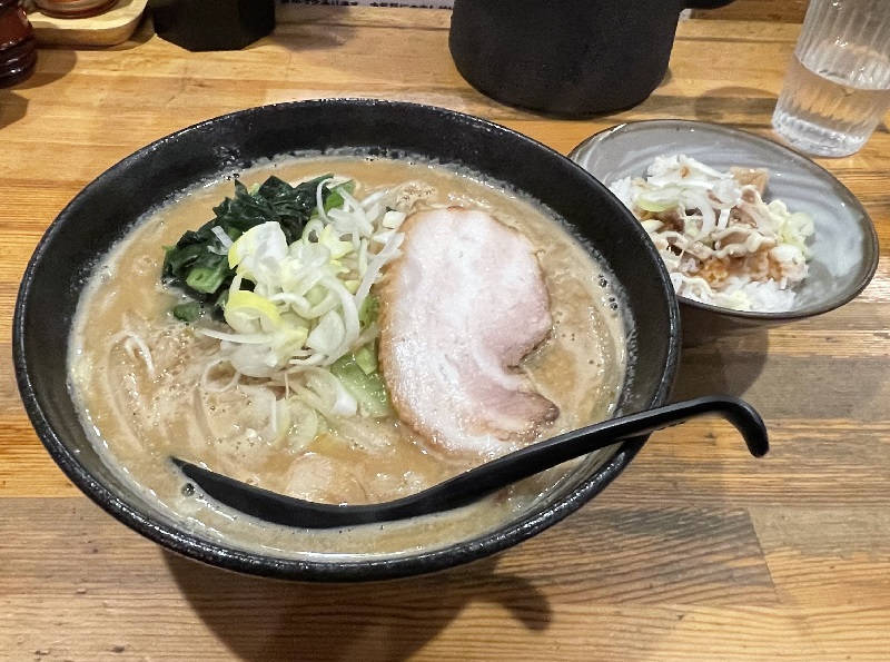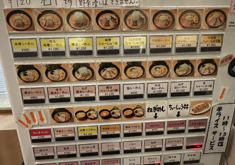 入口すぐの券売機で、看板の【味噌ラーメン】980円と【ランチセット】100円の食券を購入。昼は半ライスが無料サービスで、100円追加で「チャーシュー丼」か「ネギ丼」にしてくれます。