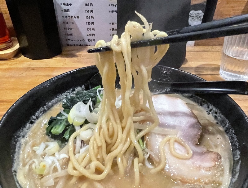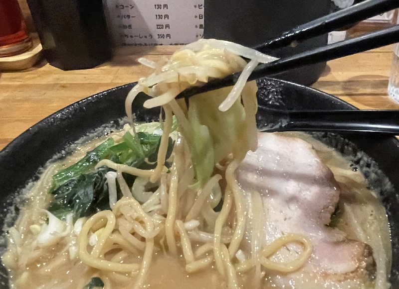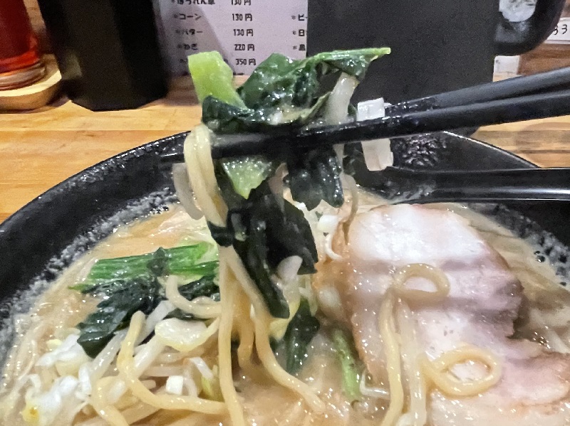 おー、味噌の塩味は割と控えめで、豚骨出汁が前面に来る感じ。ニンニクも効いてます。濃厚ながらも優しさを感じるスープ。美味しい。