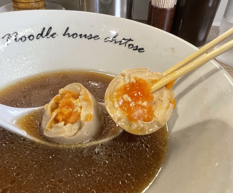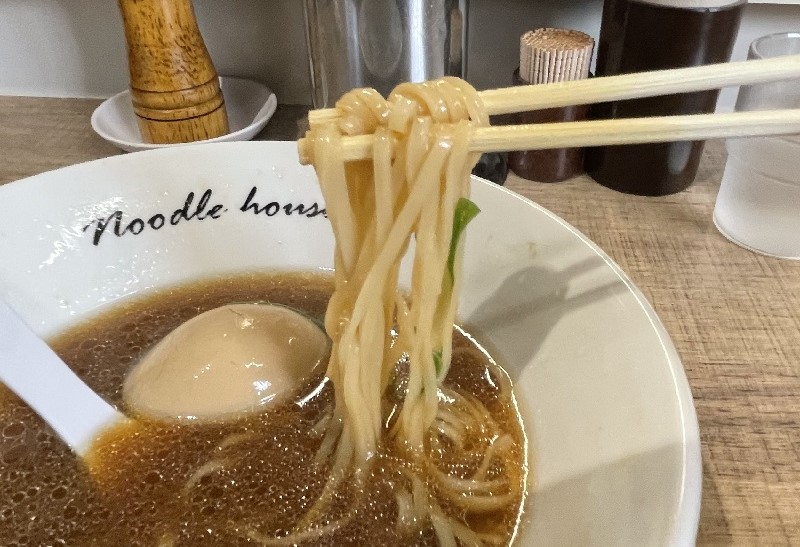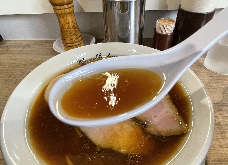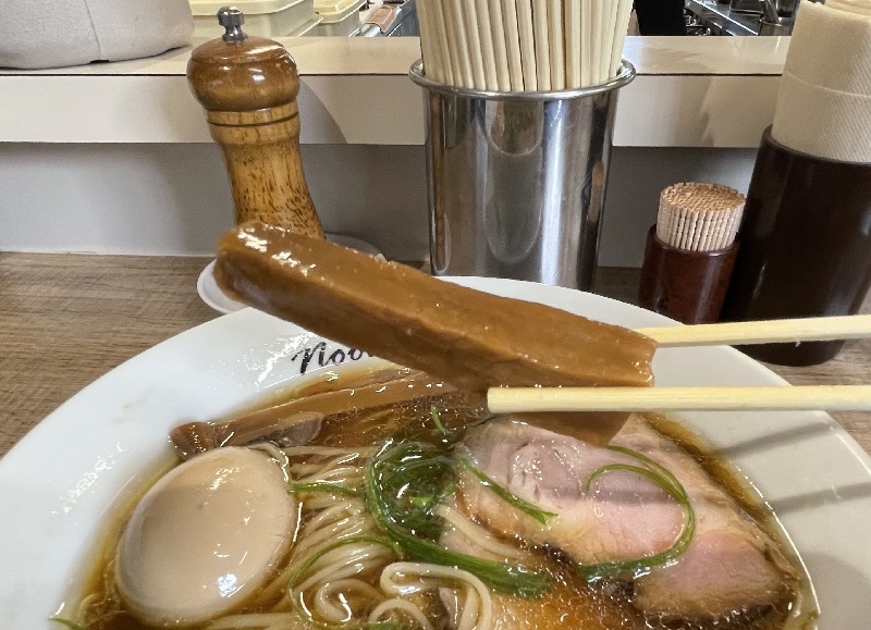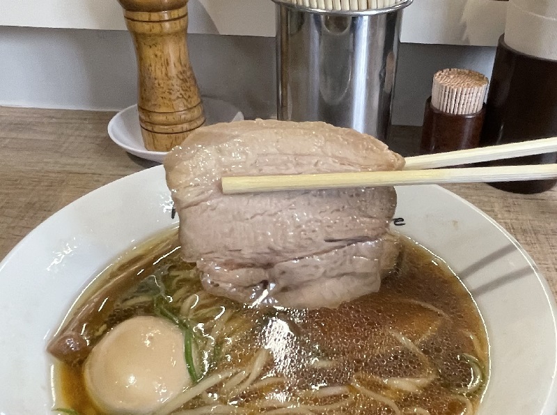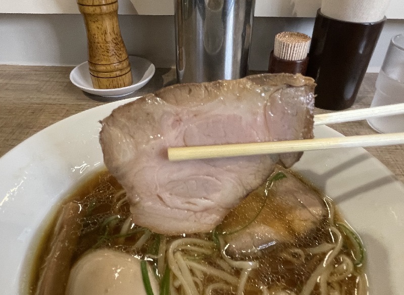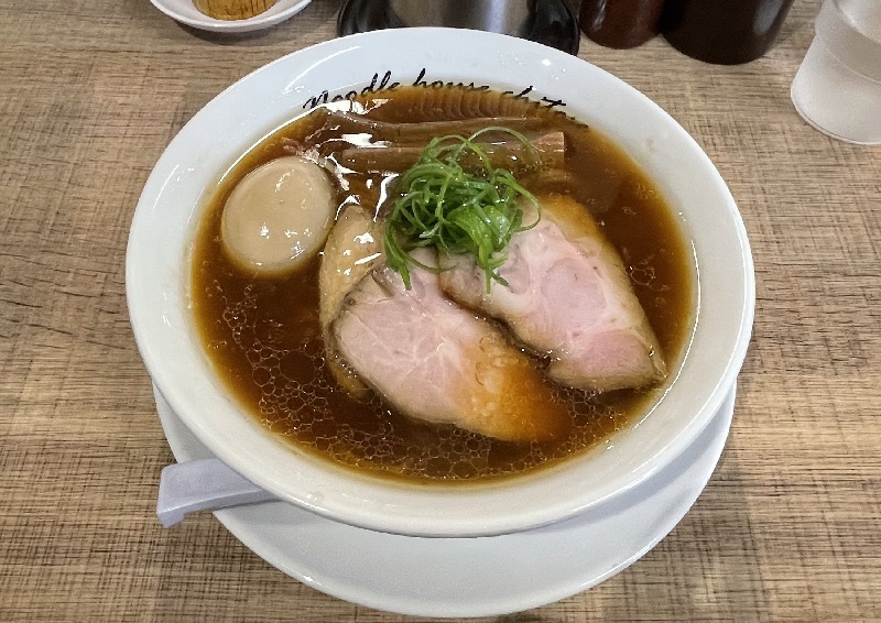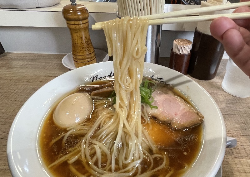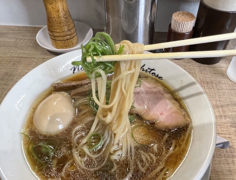 動物系と魚介系のバランス絶妙スープに、キレのある醤油カエシ。見た目よりもパンチがあります。熱々です。