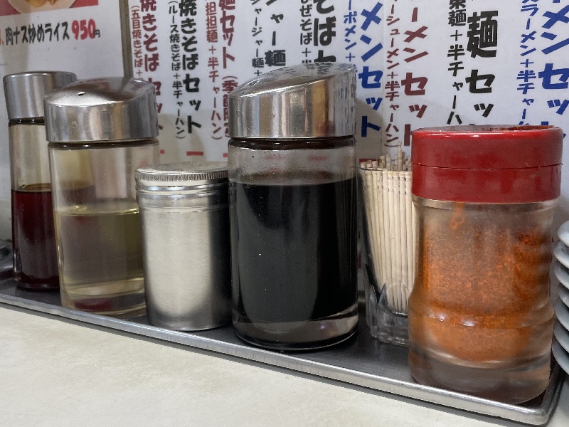 卓上には、町中華の各種調味料。オーダーは口頭注文、現金後払い制。