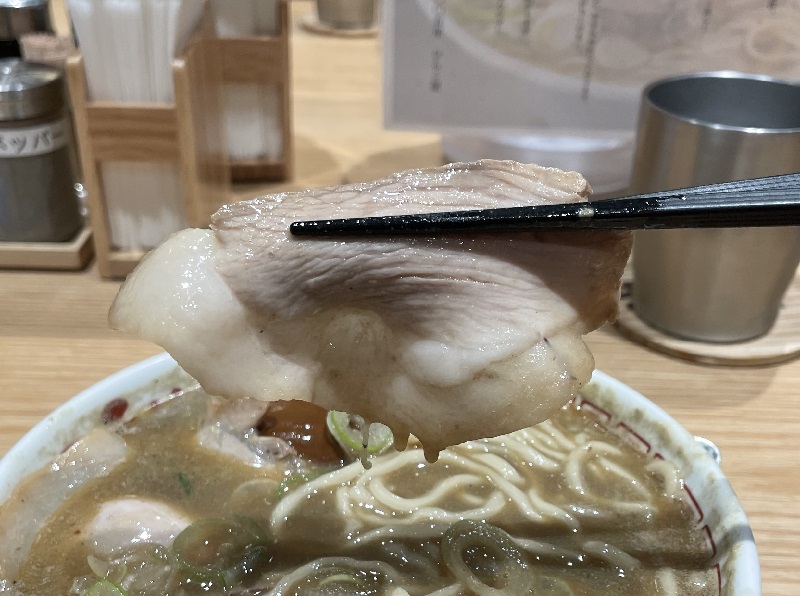 薄切りのチャーシューは、よくスープに沈めて食べましょう。