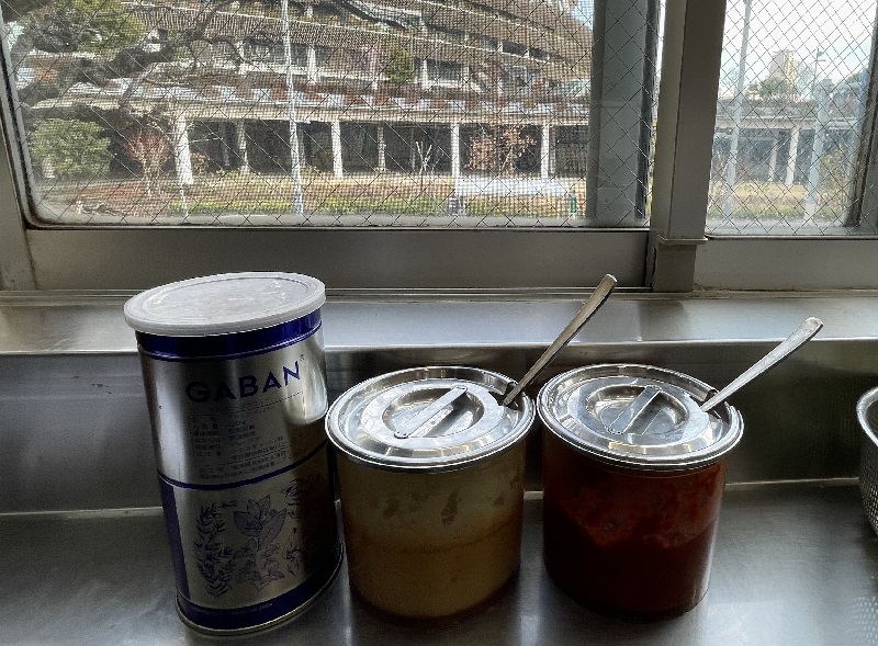 卓上調味料は、にんにく、豆板醤、胡椒。セルフのお冷は「ジャスミンティー」。