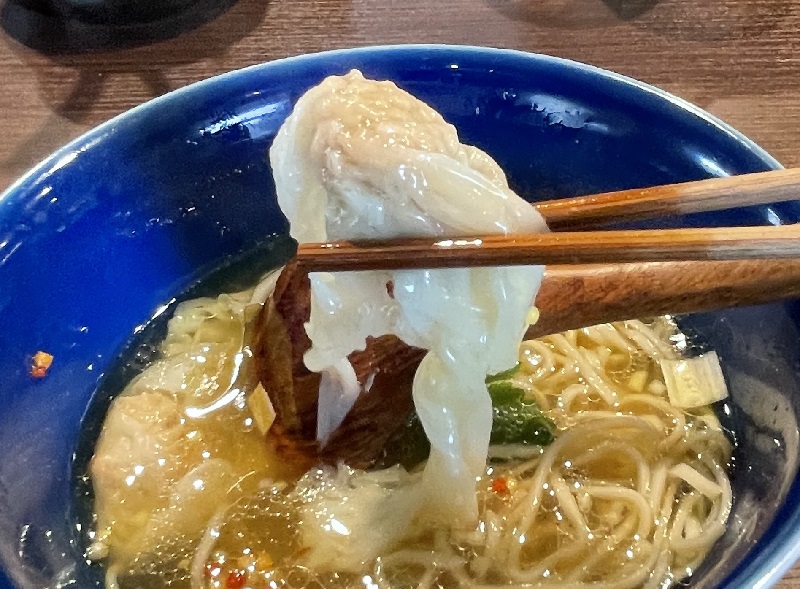 期待のワンタンは、ピロピロの皮にしっかり目の餡が詰まったタイプ。美味しい。