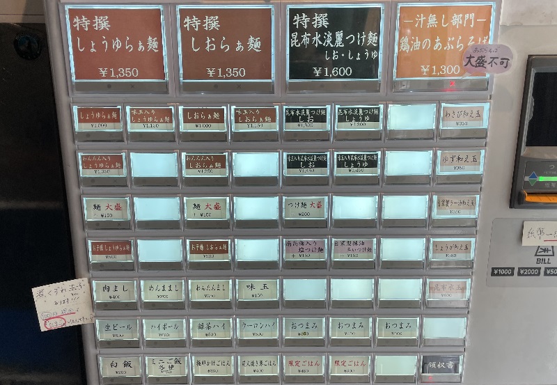 入口すぐの券売機で【特撰しおらぁ麺】1350円の食券を購入。「しょうゆ」や「つけ麺」もいいですが、やっぱり「しお」がお薦め。